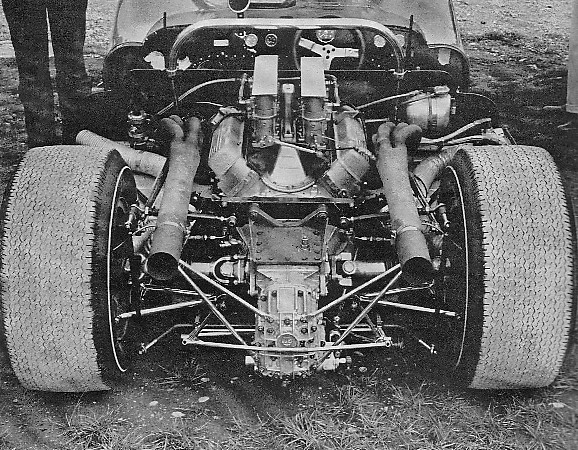 The rear suspension follows con�ventional practice, with a single Upper sidelink, a reversed lower wish�bone and trailing links for fore and aft location. Bruce is still experimenting with the upper-link length and pick-up point, trying to get the least camber change with a link about two inches longer at Kent than on the production versions, but at Riverside the car was fitted with the shorter link. The same size Girling calipers are fitted at the rear, as are fitted up front. The rear anti-sway bar runs across the chassis below the trans-axle, along the rear frame bulkhead, mounted in Teflon, attaching to the upper end of the hub carrier via vertical ball jointed links. A choice of gearboxes is offered with the five-speed ZF being fitted to Bruce's, Oldsmobiled version. Weighing but 127 pounds, the ZF is not considered heavy enough for use with bigger torquers, like Fords or Chevies, and for these applications Bruce recommends the 135�pound Hewland LG-4. The wheels are driven through Mercedes Benz internally splined drive shafts. |
