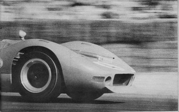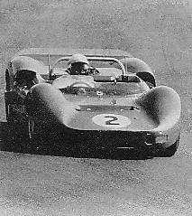 JUST ABOUT A YEAR AGO, BRUCE McLAREN ARRIVED to do battle on the North American Continent with a brand new sports/racer, designated the McLaren I. With it Bruce proceeded to take the circuit record at Mosport, just missing the record at Riverside, winning the qualification race and barely missed taking the whole show be�cause of a minor non-design-caused burst water hose. Following these very successful performances, Bruce contracted Elva Cars to produce his design in quantity, for sale to aspiring Chaparral hunters. In all there were eighteen Series McLaren I produced, with thirteen of them running in North America. Three chassis were built by McLaren's own crew; the one he raced last season (which is now used for tire testing), one car which he calls "half production" built for Dan Gurney, and now a new car for himself, the Series II, with evolutionary, rather than revolutionary changes. From all outward appearances the new Series-II McLaren looks like a completely new car. The original bodywork has been scrapped and a new body-designed by English artist Michael Turner has been fitted. Turner did not have a completely free hand to draw just what he wanted from a purely aesthetic view�point; Bruce set down a very rigid set of cross section and aerodynamic requirements, and after the final drawings were made, a model was built for wind tunnel testing. Much attention was paid to the drag and lift characteristics, with a net result of about 20-percent less drag than with the Series I. Radiator ducting studies were conducted to achieve the optimum flow characteristics. Following contemporary practices, a spoiler has been fitted to the tail of Bruce's car, but a very original bit of thinking went into its construction It is fabricated from craft quality Plexiglass, and is clear, enabling the driver to see behind him. Many spoilers hinder rearward vision. After a couple of appearances it was noted that three or four other cars switched to clear Plexiglass spoilers. At Mosport this year in the new car, McLaren led 96 of 100 laps, only be overtaken by Jim Hall's Chapparal in the closing moments. At Kent Phil Hill took over the controls, putting up the only threat to the Chapparals, finally taking the lap record at 1:20 flat, Phil led until he was forced into the pits to repair a sticking throttle. Bruce skipped Laguna Seca and made his next appearance at Riverside, where he smashed the lap record with a 1 :26,6, 1d easily won the qualifying race. In the main event, Bruce found himself in the wrong gear at the start, then in the pits to replace a flat tire, finishing a strong third, much closer, to the winner than the time consumed in his pit stop. Like the Series I, Bruce's Series II is constructed of round and square tubing with only subtle changes made for strengthening. Four main rails are used, with truss-type out�riggers above the side mounted, pontoon-like fuel tanks, adding to the rigidity. The floor pan, as well as the wheel-well sheet metal, is stressed. The firewall behind the driver is aluminum-alloy sandwiching a wood core, with a removable center door in the firewall to get at the front accessory drive units on the engine. A pair of semi-reclining alloy bucket seats are fitted. |