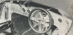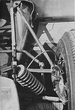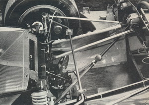 Anti-dive front suspension layouts are used with very-wide-based pickup points. The upper A-arm has a side link, with a leading arm attached to the cockpit scuttle-hoop. The lower A-arm is comprised of a side link with a trailing arm attaching to a forward frame member, placing the fore and aft suspension arms in tension instead of compression. Inclination of the upper arm reduces the tendency to nosedive under braking loads. An anti-sway bar crosses the frame above the driver's feet, angling forward to join the lower A-arm via a ball-jointed vertical link. The bar is carried in a Teflon bearing surface, is removable and is attached with screws. Telescopic shocks, wrapped with adjustable-tension coil springs are fitted front and rear. Girling BR calipers squeeze 12-inch meehanite discs. Steel braided, Teflon, Aeroquip brake lines are fitted. which eliminate any spongy feel in the pedal. Cool air is fed to the discs via flexible hose, with the air inlets in the nose. |