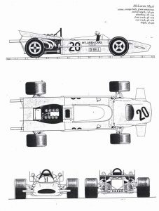 He used the M7B, as it become known, for a while then sold it to Colin Crabbe who entered it for Formula 1 races for Vic Elford to drive. To replace this car Bruce McLaren built a Formula 1 version of the M10 car which was used in Formula 5000 races. This is a monocoque very similar to the M7A but since it is intended for a variety of big American V8 engines it has an extension of the monocoque to support the engine. This is a monocoque very similar to the M7A but since it is intended for a variety of big American V8 engines it has an extension of the monocoque to support the engine. This was deleted for the Formula 1 car and the same method of attachment used as on the M7A. The monocoque differs mainly in that it is swept back and upwards alongside the cockpit to form an integral roll-over bar behind the driver’s head, thus strengthening the chassis. Mechanically the car is much the same as the M7A, using the same suspension components although modifications were made to the suspension geometry. It started off with 15in wheels but a switch was made to 12in front wheels, which meant a reduction in front brake size rim 11.11in to 10.5in. It ran in this form for most of the season, the only other major change being the addition of a small pannier tank for the longer races.